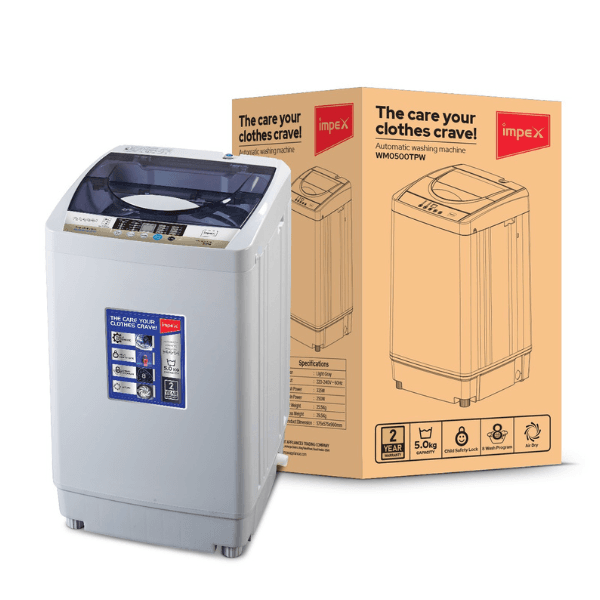 غسالة ملابس اوتوماتيك امبكس 5 كجم مع 8 برامج غسيل وظيفة تجفيف هواء فضي – WM0500TPW